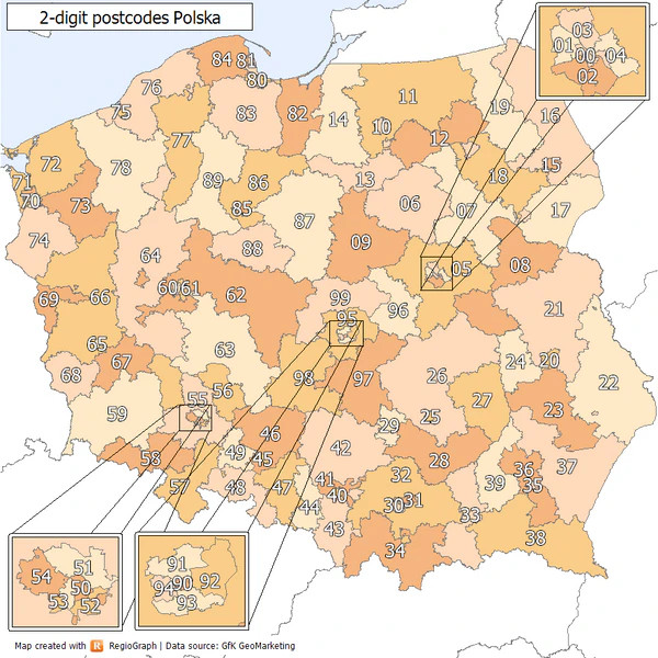 Вторая цифра означает зону внутри округа. За крупными городами и административными центрами воеводств закреплено от 1 до 5 цифр зон: