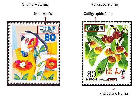 Хотя на обоих видах почтовых марок обозначено слово «NIPPON» («Япония») латиницей, тем не менее до 2007/2008 года они различались формой написания японского слова «日本郵政» (буквально «Почта Японии»), которая была более архаичной для почтовых марок префектур. При этом на общенациональных марках графическая форма была представлена прямолинейными сегментами, а на марках префектур она была менее угловатая и имела больше изгибов[1].