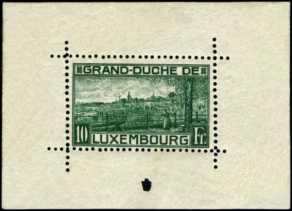 Обычно считается[2][3][5], что первый в мире почтовый блок был выпущен 3 января 1923 года в Люксембурге (Yt #123; Sc #151) по случаю рождения 22 декабря 1922 года принцессы Елизаветы. Он включал одну марку с использовавшемся в более раннем выпуске видом Люксембурга, номиналом в 10 франков, был без надписей на полях и имел размеры от 78 × 59 мм до 79 × 61 мм[≡]. По имеющимся сведениям[6], первоначально было намечено выпустить почтовую марку. Однако в типографии, получив печатную форму одной марки вместо размноженной формы для 50-марочного листа, решили по недоразумению напечатать марку на отдельных миниатюрных листках — по одной на каждом. И лишь в марте того же года эта марка была издана в виде обычных марочных листов (Sc #152)[2][7].
