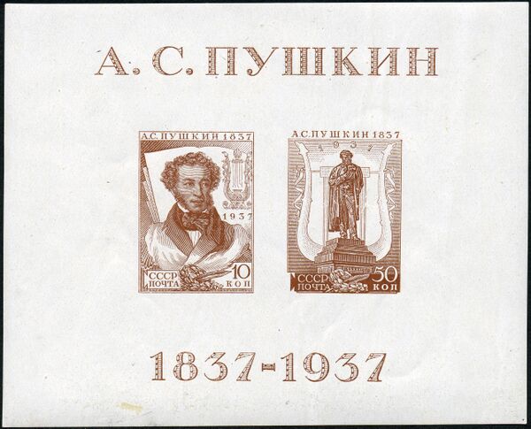 Первый советский памятный блок был издан в феврале 1937 года в связи с выставкой, организованной в ознаменование 100-летия со дня смерти А. С. Пушкина (ЦФА [АО «Марка»] № 542)[≡]. Известен также редкий блок, выпущенный крайне ограниченным тиражом (всего 500 экземпляров) по случаю I Всесоюзной филателистической выставки в декабре 1932 года (ЦФА [АО «Марка»] № 405), который, несмотря на включение в каталог ЦФА, в почтовом обращении не был и является скорее сувенирным листком[8].