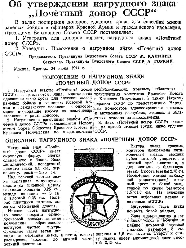 Нагрудным знаком «Почетный донор СССР» награждались лица, многократно сдавшие кровь для спасения жизни больных и пострадавших при защите социалистического Отечества, охране Государственной границы СССР и общественного порядка, стихийных бедствиях и несчастных случаях, одновременно проводящие работу по вовлечению населения в ряды доноров[1].