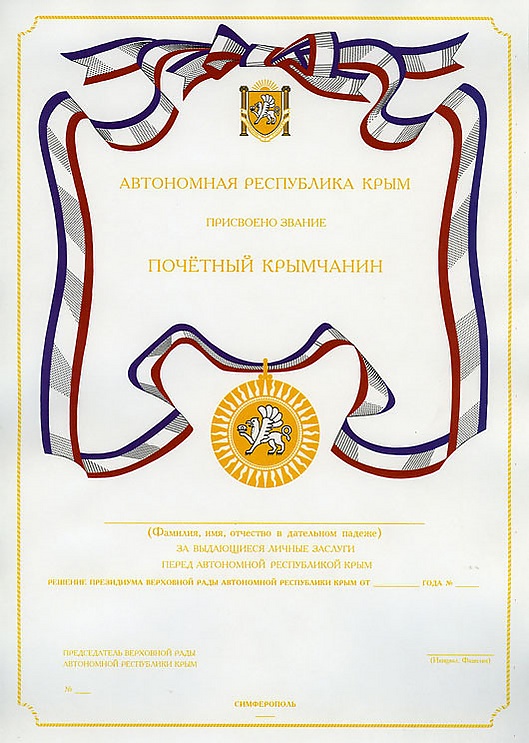 | Основания награждения | за выдающиеся личные заслуги перед Автономной Республикой Крым |