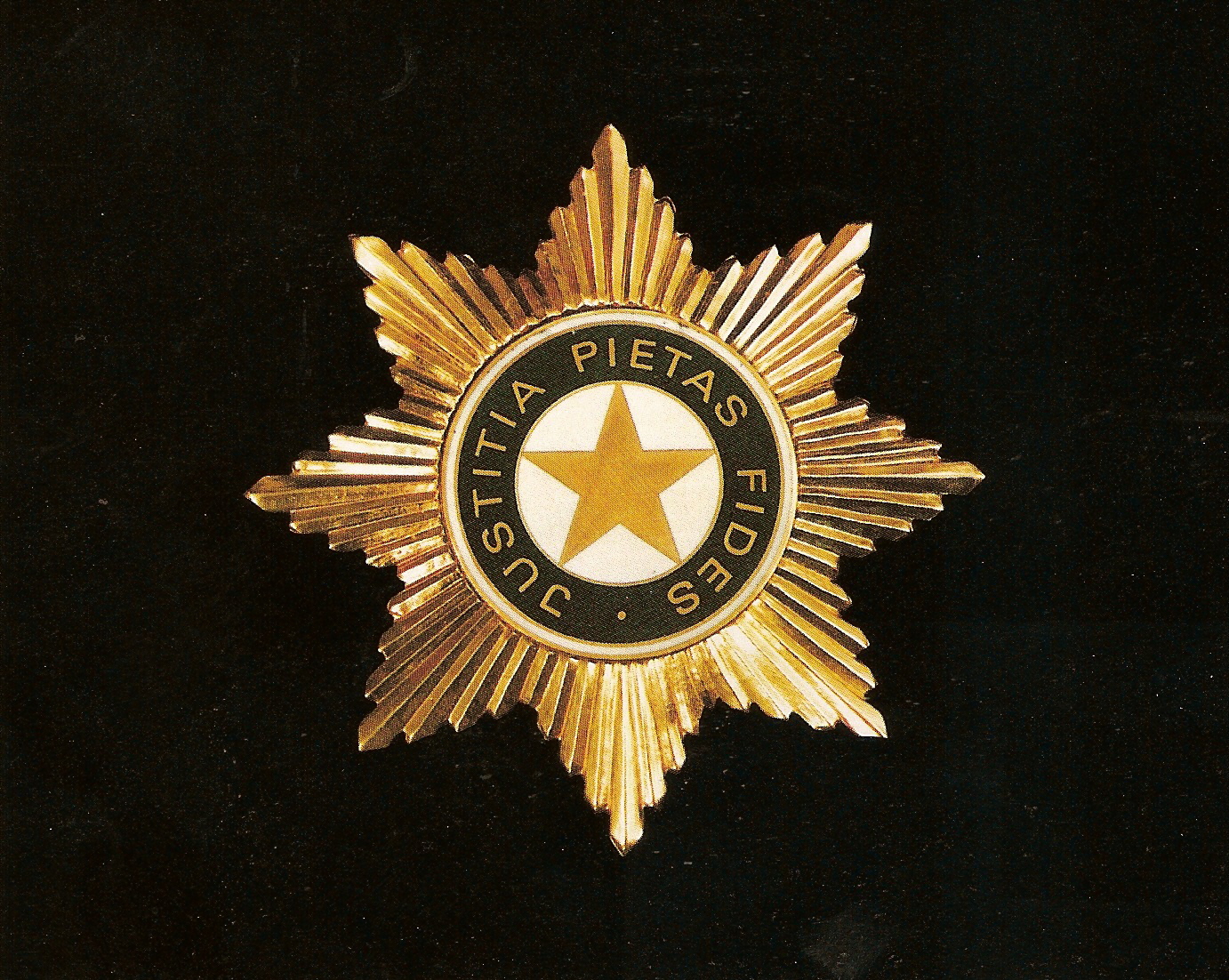 Знак ордена — золотая пятиконечная звезда с двугранными лучами и шариками на концах. Между лучей штралы, состоящие из пяти разновеликих двугранных заострённых лучиков, расположенных пирамидально. В центре звезды круглый медальон с двойной каймой. В медальоне на эмали белого цвета изображение пятиконечной золотой звезды. На кайме зелёной эмали с внешним кантом белой эмали надпись: «JUSTITIA — PIETAS — FIDES».