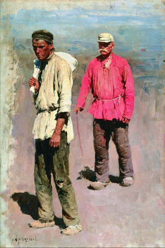 На полотне изображены две мужские фигуры, идущие по пыльной дороге одна за другой справа налево. Первая фигура одета в белую рубашку и брюки, на голове шапочка; мужчина держит перекинутый через плечо белый мешок правой рукой, левая рука опущена, корпус развёрнут на три четверти. Следующий за ним мужчина в розовой рубашке, брюках и белой военной фуражке держит в правой руке палку и изображён почти анфас. Композиция построена в соответствии с традициями бытового жанра, подчёркивая повседневность сцены.