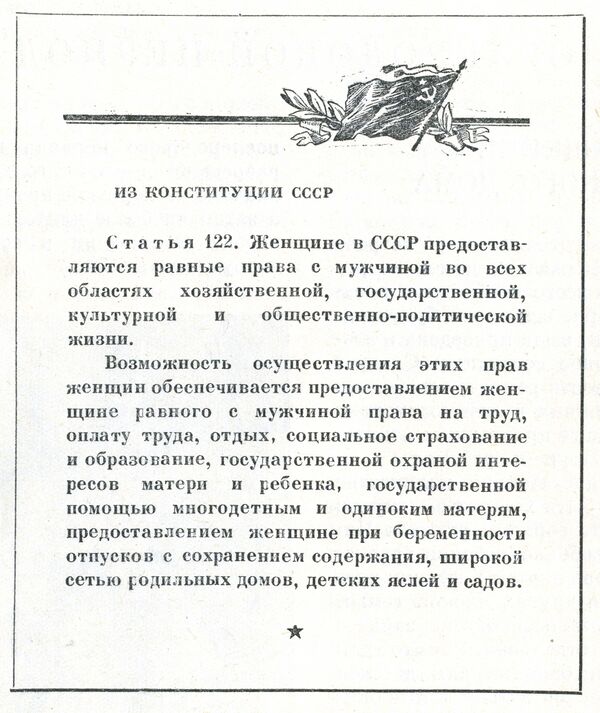 Октябрьская революция 1917 года революция положила начало глубоким и всеохватывающим переменам в положении женщин России. В декабре 1917 года ВЦИК и СНК приняли декреты о браке и разводе, которыми мужу и жене были предоставлены равные права. В январе 1918 года III Всероссийский съезд Советов утвердил Декларацию прав трудящегося и эксплуатируемого народа, которая предоставила женщинам равные политические права с мужчинами. В июле 1918 года первая советская конституция закрепила эти права и юридическое равенство мужчины и женщины. 1920-30-е годы стали временем массового вовлечения женщин в общественную деятельность[15].
