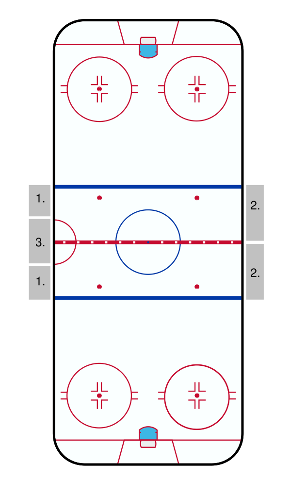 - Границы средней зоны (синие линии) будут располагаться в 19,5 м от линии ворот и в 22,86 м от лицевого борта. Увеличение зоны атаки на 1,22 м должно сделать хоккей более атакующим, в частности, при игре в большинстве.