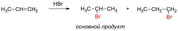 Когда несимметричный алкен соединяется с галогеноводородной кислотой, галоген присоединяется к атому углерода, содержащему меньше атомов водорода, то есть к атому углерода, на который больше влияют другие атомы углерода[2].