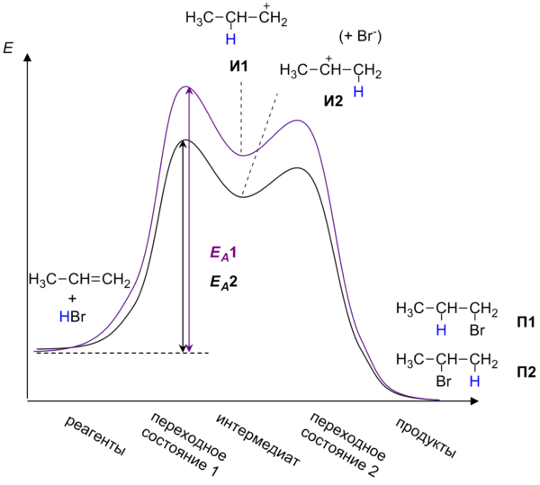 Реакция протекает в две стадии. На первой, медленной, стадии происходит присоединение протона H+ к двойной связи: при этом протон может связываться с одним из двух атомов углерода, образующих двойную связь. Образующиеся карбокатионы И1 и И2 имеют различную энергию (устойчивость), поскольку положительный заряд в них делокализуется с разной эффективностью. По этой причине вторичный карбокатион И2 является более устойчивым, и соответствующий ему бромид П2 образуется в большем количестве.