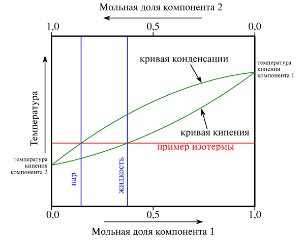 Например, система двух жидкостей, смешивающихся в произвольном соотношении, таких как толуол и бензол, не образующих азеотропную смесь, и находящихся в равновесии с её паром, может быть описана диаграммой температуры кипения, показывающую состав двух равновесных фаз в зависимости от температуры при фиксированном давлении.
