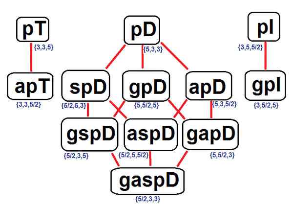 Ячейки (3-мерные многогранники), их грани (многоугольники), многоугольные рёберные фигуры и многогранная вершинные фигуры представлены их символами Шлефли.