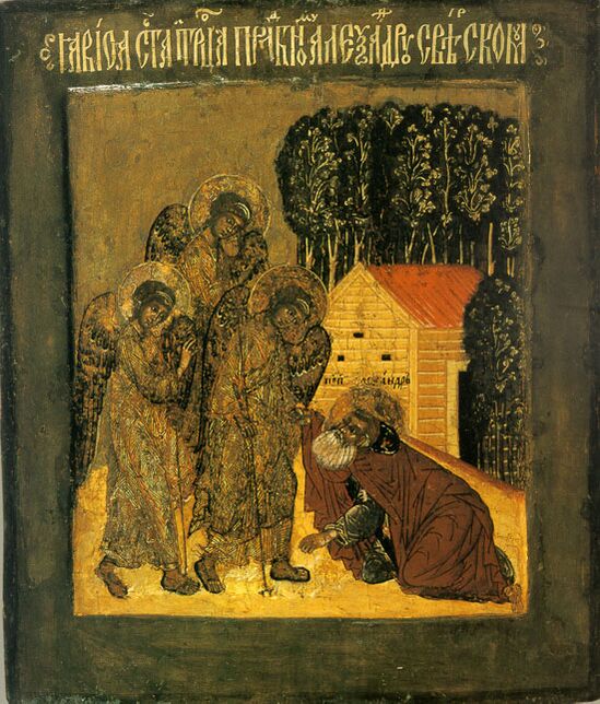 И явился ему Господь у дубравы Мамре, когда он сидел при входе в шатер, во время зноя дневного. Он возвел очи свои и взглянул, и вот, три мужа стоят против него. Увидев, он побежал навстречу им от входа в шатер и поклонился до земли, и сказал: Владыка! если я обрел благоволение пред очами Твоими, не пройди мимо раба Твоего; и принесут немного воды, и омоют ноги ваши; и отдохните под сим деревом, а я принесу хлеба, и вы подкрепите сердца ваши; потом пойдите; так как вы идете мимо раба вашего… И взял масла и молока и телёнка приготовленного, и поставил перед ними, а сам стоял подле них под деревом. И они ели.