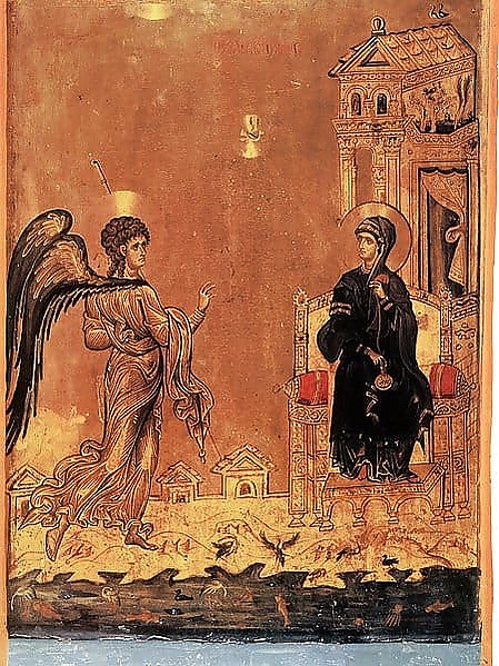 - Благовещение Пресвятой Богородицы. Двунадесятый праздник. Ровно за 9 месяцев до Рождества Христова Деве Марии явился архангел Гавриил с благой вестью: «/…/зачнёшь во чреве, и родишь Сына, и наречёшь Ему имя: Иисус. Он будет велик и наречётся Сыном Всевышнего, и даст Ему Господь Бог престол Давида, отца Его; и будет царствовать над домом Иакова во веки, и Царству Его не будет конца» (Лк 1:30-33)[28]. На вопрос Марии «Как будет это, когда Я мужа не знаю?» Гавриил ответил: «Дух Святый найдёт на Тебя, и сила Всевышнего осенит Тебя; посему и рождаемое Святое наречётся Сыном Божиим» (Лк 1:35). Мария дала согласие: «Се, Раба Господня; да будет Мне по слову твоему» (Лк 1:38). По учению Церкви, в момент согласия Марии таинственным образом совершилось непорочное зачатие[29].