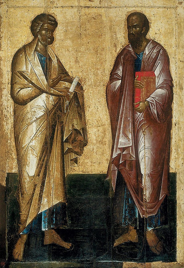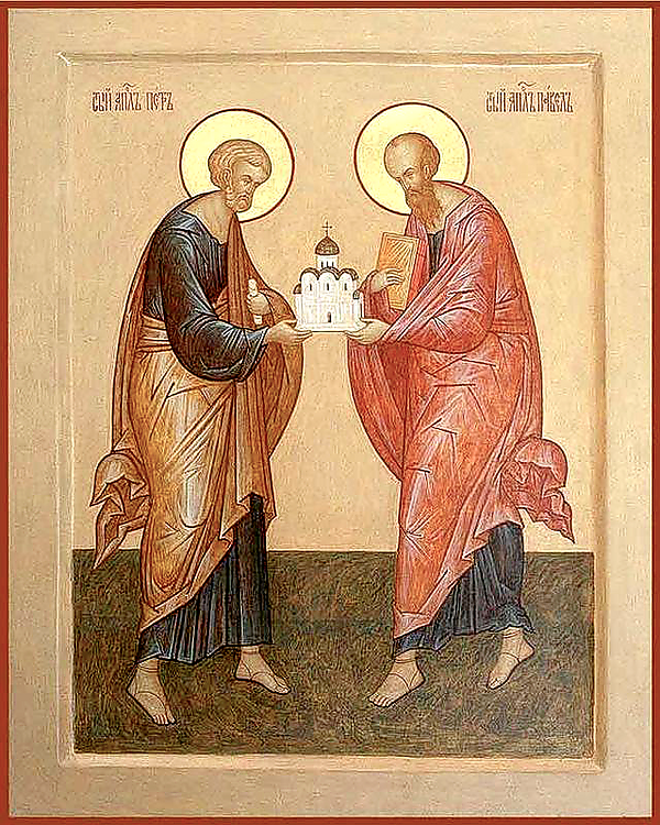 - Первоверховные апостолы Пётр и Павел. Великий праздник. Почитание апостолов Петра и Павла как святых началось сразу после их мученической кончины: апостолы погибли в один и тот же день (по мнению некоторых историков с разницей в год). Совместное празднование двух апостолов распространилось уже в первые века христианства; его связывают с перенесением мощей апостолов, которое произошло в Риме 12 июля 258 года. Первые храмы двум апостолам стали строить при Константине Великом в 324 году, и вскоре день Петра и Павла вошёл в число наиболее торжественных христианских праздников[23].