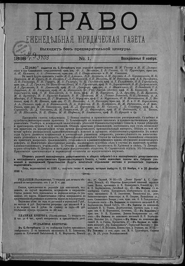 Первый номер газеты вышел 20 ноября 1898 под редакцией В. М. Гессена и Н. И. Лазаревского. Историю издания, условно, можно разделить на два периода: в 1898—1905 гг. газета освещала, преимущественно, теоретические и практические вопросы права, то после революционных потрясений 1905 года всё большее внимание начинает уделяться политической ситуации. В 1905—1917 гг. издание можно отнести к кадетским, на страницах газеты публиковались В. М. Гессен, И. В. Гессен, Д. Д. Гримм, А.А, Жижиленко, Б. Э. Нольде, А. И. Каминка, В. Д. Набоков, М. Е. Пергамент, Н. И. Лазаревский и многие другие видные отечественные правоведы и общественные деятели. За 1899—1916 гг. к газете имеются указатели, которые существенно упрощают работу исследователей. В настоящий момент практически весь комплект газеты оцифрован Российской национальной библиотекой.