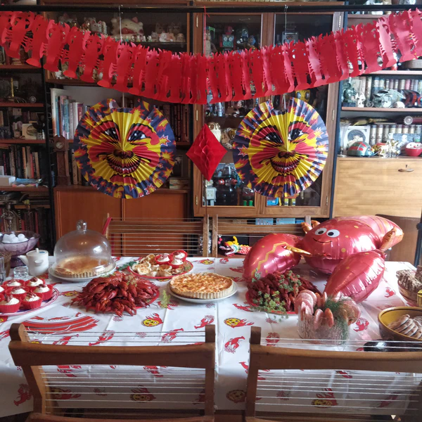 Украшение праздничного вечера — цветные бумажные фонарики, тарелки, салфетки, нагрудники, пёстрые бутафорские колпаки на головах. Аксессуары насыщены самыми разнообразными изображениями раков, полной луны (видимо в связи с тем, что раков было принято ловить по ночам[1]). Магазины украшаются различной атрибутикой, связанной с праздником. В продаже предлагаются специальные ножи для разделки, в книжных магазинах особые праздничные сборники песен, а продовольственные магазины заманивают скидками на раков[1]. Раков проблематично быстро съесть, поэтому во время трапезы завязываются разговоры, люди могут пообщаться между собой в неформальной, дружеской обстановке[1]. Во время периода праздников устраиваются корпоративные вечеринки. С этой целью среди сотрудников могут проводиться соревнования по вылову раков. Застолье сопровождается пением особых песен.