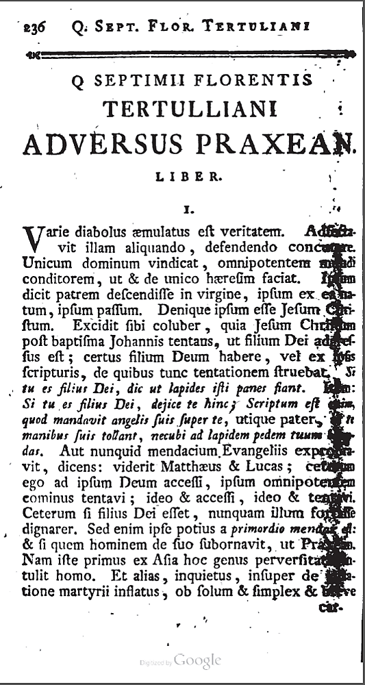 - Tertullianus. Adversus Praxean Архивная копия от 19 апреля 2017 на Wayback Machine