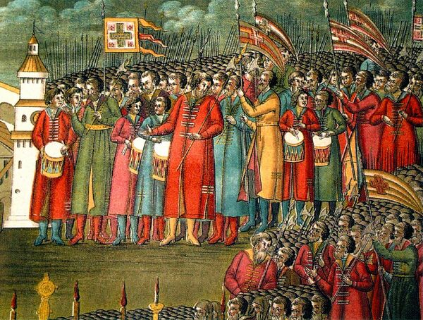 В конце XVII века появляются прапоры стрелецких начальников — стрелецкий голова.