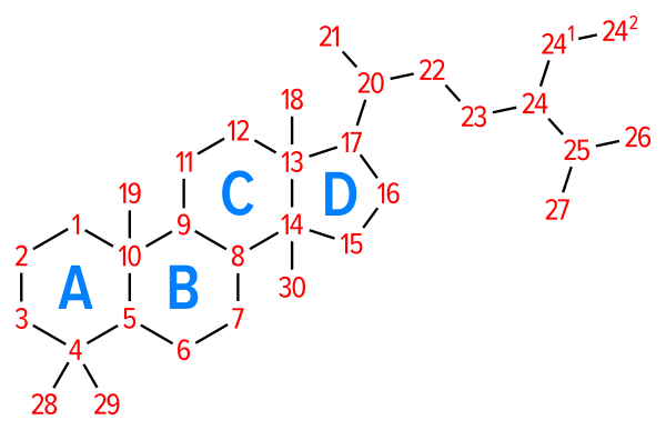 Прегнаны представляют собой производные стероидов с углеродами, присутствующими в положениях с 1 по 21.