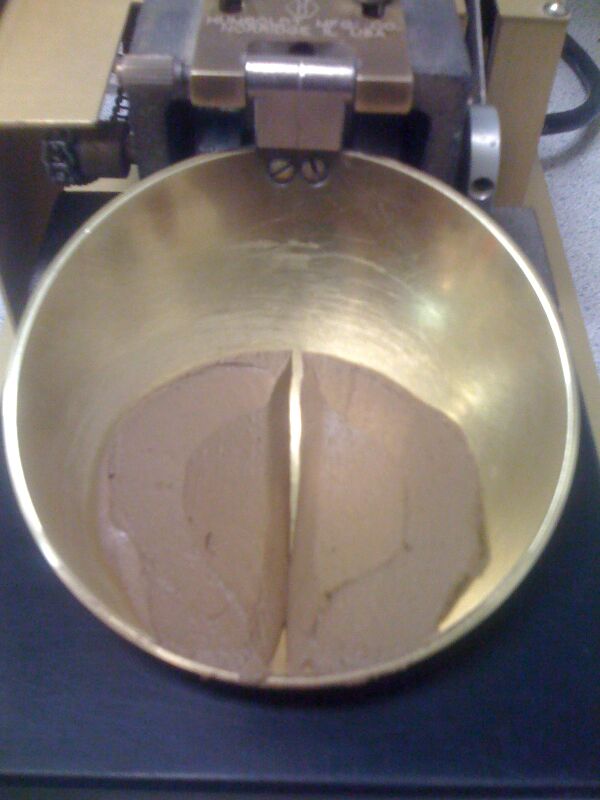 Оригинальный тест Аттерберга на определение предела текучести подразумевал смешивание куска глины в круглодонной фарфоровой миске на 10-12 мл. см диаметр. Лопаткой прорезали канавку в куске глины, а затем чашу много раз ударяли по ладони одной руки. Впоследствии Касагранде стандартизировал аппарат (путем включения кривошипно-кулачкового механизма для стандартизации опускания) и процедуры, чтобы сделать измерения более воспроизводимыми.