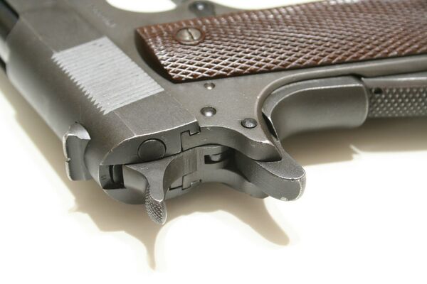 В рамку рукоятки пистолета M1911 вставляется рукояточный предохранитель, который блокирует курок, не давая ему сорваться со взвода, пока рукоятка полностью не обхвачена рукой.