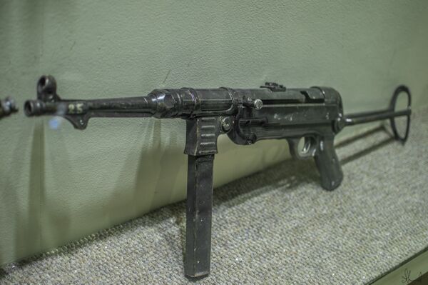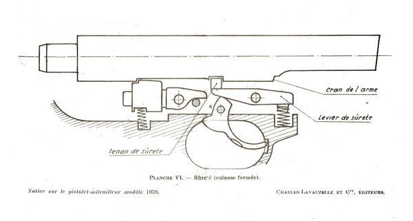 Схожую проблему имел и британский ПП Стен Эта проблема так и не была решена во время ВМВ, однако уже после войны во Франции выпускались варианты Стена со схожим фигурным пазом для предохранителя в передней части прорези ствольной коробки.