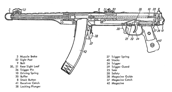 ПП Suomi с автоматическим предохранителем для блокировки затвора в переднем или заднем положении: #6 При нажатии на спусковой крючок, рычаг опускается, чтобы верхний его выступ отодвинулся от затвора и оружие могло стрелять.