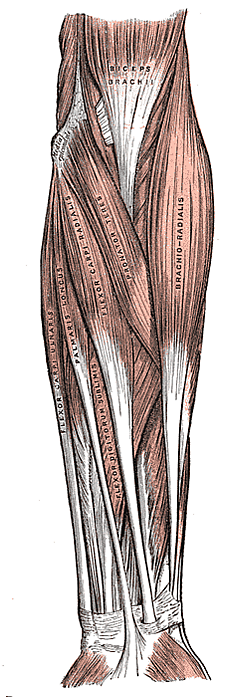 - первый слой — круглый пронатор (мышца, вращающая кисть внутрь), локтевой сгибатель запястья, лучевой сгибатель запястья, длинная ладонная мышца;