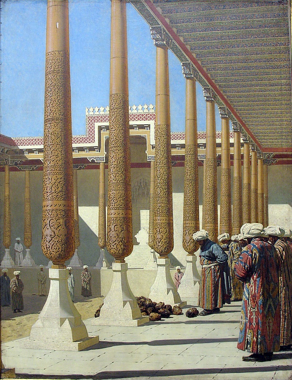 На полотне изображена сцена, происходящая в тронном зале дворца бухарского эмира в Самарканде. Дворец принадлежал воинственной династии Тимуридов до XVI века. Согласно легенде, дворец назвался Кок-Таш, которое соответствует названию трона тюрко-монгольского завоевателя Тамерлана, основавшего империю Тимуридов.