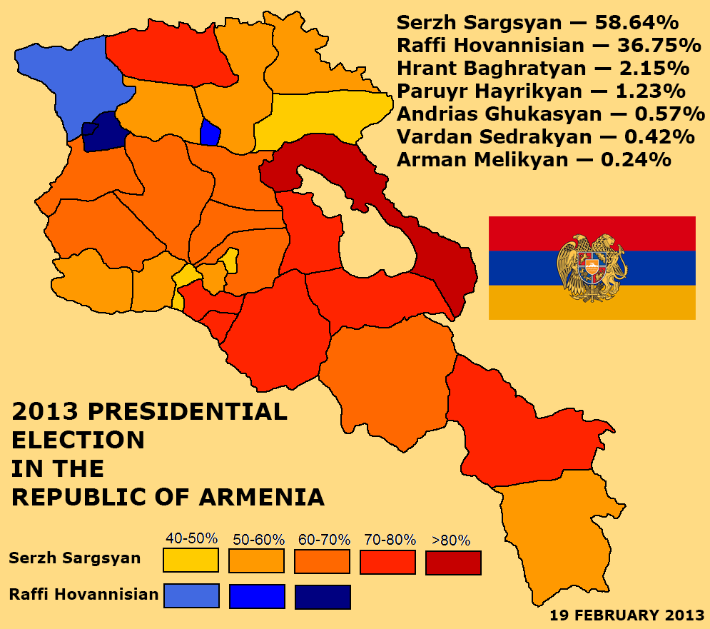 Президентские выборы в Армении 2013 года проходили 18 февраля. Президент Серж Саргсян был переизбран на второй срок, получив абсолютное большинство голосов в первом туре (58,6 %). Его ближайший соперник лидер партии «Наследие» Раффи Ованнисян оказался на втором месте с 36,8 % голосов. Явка составила 60 %[1].