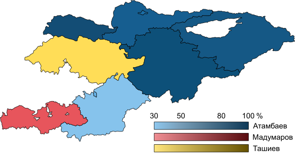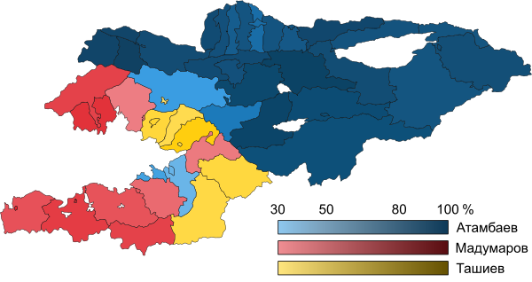 | Кандидат | Алмазбек Атамбаев | Адахан Мадумаров | Камчыбек Ташиев |