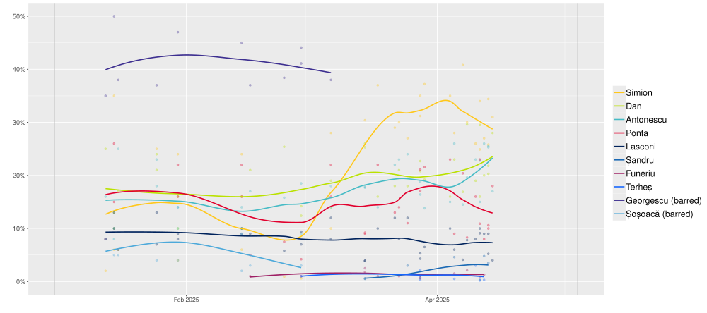 Средняя кривая опросов о предпочтениях кандидатов в президенты Румынии: