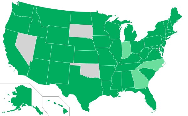 Нью-Джерси, Юта, Висконсин[42] (Алабама, Индиана, Айдахо, Айова, Нью-Гэмпшир, Огайо, Пенсильвания, Род-Айленд, Техас, Юта, Вермонт, Западная Виргиния)[44][46][49][50][51][52][53] |