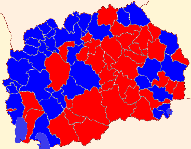 | Результаты второго тура выборов: синим обозначены общины, где победил Пендаровски; красным обозначены общины, где победила Силяновска-Давкова. | |||