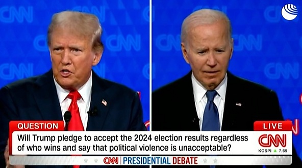 Ключевыми темами первого этапа телевизионных дебатов, которые прошли в студии CNN 27 июня 2024 года, стали: экономическое положение страны, нелегальная миграция, утрата Америкой доминирования на международной арене, конфликт на Украине, растущий вес России и Китая, проблемы с законом у Трампа и членов семьи Байдена, состояние здоровья кандидатов и даже совместная игра в гольф[10]. Ярче всего проиллюстрировала уровень дискуссий, развернувшихся между сорок пятым и сорок шестыми президентами США, фраза ведущей Даны Баш — «давайте не будем вести себя как дети», — произнесённая в тот момент, когда Трамп и Байден пикировались по поводу навыков в гольфе[10]. Войдя в студию и при этом демонстративно не поздоровавшись друг с другом, оппоненты и далее в течение полутора часов не проявляли взаимного уважения и не упускали случая, чтобы опуститься до неприглядных подробностей в отношении друг друга.