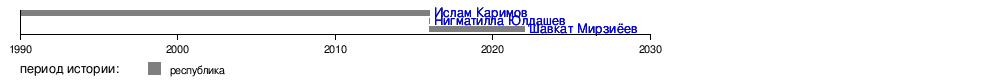 | ВрИО | Нигматилла́ Тулки́нович Юлда́шев | 2 сентября 2016 | 8 сентября 2016 | 6 дней | Демократическая партия «Национальное возрождение» | ||