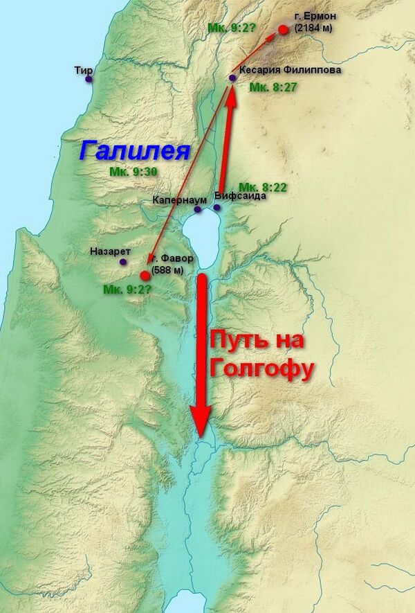 Гора, на которой произошло Преображение (Мк.9:2), (Мф.17:1), (Лк.9:28), не называется евангелистами по имени, но церковное Предание единогласно указывает на гору Фавор, находящуюся в Галилее, в 6 км на юго-восток от Назарета[8][9][10][11]. Так, в том, что Преображение Спасителя совершилось на горе Фавор, были убеждены Ориген (III век, «Комментарий на 88-й псалом»), святитель Кирилл Иерусалимский (IV век, «Огласительные поучения»)[12]. Cвятитель Кирилл Иерусалимский пишет в «Огласительных поучениях» о свидетелях Преображения Илие и Моисее: