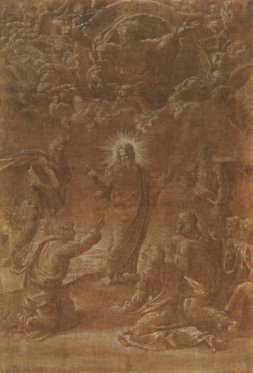 Первый эскиз к картине, выполненный Джулио Романо в мастерской Рафаэля в масштабе 1:10, изображает Бога-Отца в сонме ангелов, благословляющего Христа на горе Фаворской в присутствии Илии, Моисея и коленопреклонённых апостолов — Иоанна, Иакова и Петра[2]. Второй эскиз, ныне хранящийся в Лувре, выполнил Джанфранческо Пенни. В него был добавлен другой евангельский сюжет, что является нетипичным для христианской живописи, и именно он стал основой будущей картины[4].