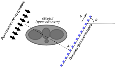 В компьютерной рентгеновской томографии линейка детекторов измеряет поглощение исследуемым объектом параллельного пучка излучения (например, рентгеновских лучей в медицинской томографии, сейсмических волн в геофизической томографии). В соответствии с законом Бугера-Ламберта-Бера интенсивность излучения, измеряемая детектором в точке s линейки пропорциональна , где показатель поглощения вещества объекта для данного типа излучения, а интеграл берётся вдоль прямой , проходящей через данный детектор и перпендикулярной линейке детекторов (z — координата на этой прямой). Соответственно, логарифм от интенсивности, взятый с обратным знаком, даёт преобразование Радона от показателя поглощения. Вращая систему из источника излучения и детектора вокруг объекта (при этом оставаясь в одной плоскости), или вращая сам объект вокруг оси, перпендикулярной плоскости, показанной на рисунке, получают множество луч-сумм в выбранном срезе объекта. Затем, используя один из методов реконструкции, можно восстановить распределение показателя поглощения в любой точке прозондированной плоскости объекта.