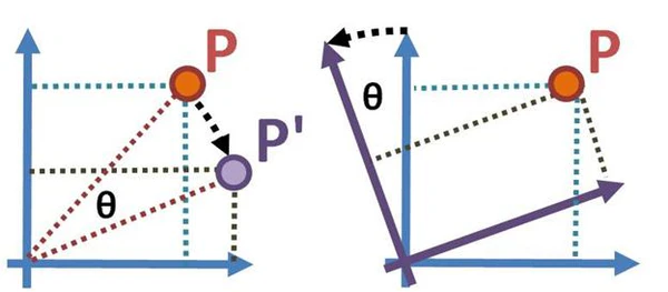 - Пассивная точка зрения — происходит смена координат точек многообразия. Все точки при этом остаются на своих местах.