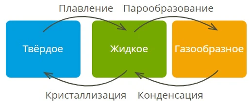 Все вещества могут находиться в трёх основных агрегатных состояниях: газообразном, жидком и твёрдом. Они могут переходить из одного состояния в другое при изменении внешних условий (температуры, давления), что называется фазовыми переходами.