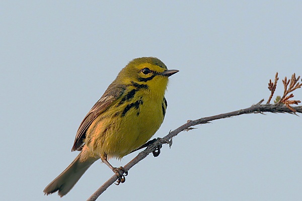 Верх оперения оливково-зелёного цвета с чёрными полосами по бокам и с v-образными или полукруглыми чёрными полосками ниже глаз и по глазам. Хвостовые перья черноватые, а оперение низа жёлтого цвета.