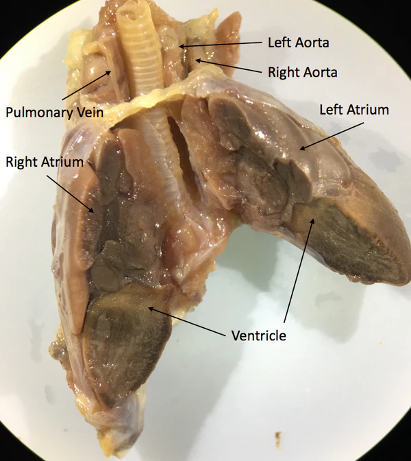 Например, сердце игуаны, как и большинство чешуйчатых сердец, состоит из трёх камер с двумя аортами и одним желудочком, сердечными непроизвольными мышцами. Основными структурами сердца являются венозный синус, водитель ритма, левое предсердие, правое предсердие, атриовентрикулярный клапан, венозная полость, артериальная полость, лёгочная полость, мышечный гребень, вентрикулярный гребень, лёгочные вены и парные дуги аорты[80].