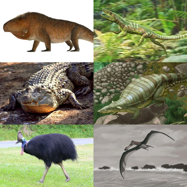 В конце пермского периода произошло крупнейшее известное массовое вымирание (см. Пермско-триасовое вымирание)[24]. Большая часть более ранней парарептильной и синапсидной мегафауны исчезла, заменившись похожими на современных рептилиями, особенно архозавроморфами. Они характеризовались длинными задними ногами и прямохождением, ранние формы чем-то напоминали длинноногих крокодилов. Архозавры стали доминирующей группой в триасовый период, хотя потребовалось 30 миллионов лет, прежде чем их разнообразие стало таким же большим, как у животных, живших в пермском периоде[24]. Архозавры превратились в хорошо известных нам динозавров и птерозавров, а также предков крокодилов. Поскольку рептилии, сначала рауизухии, а затем динозавры, доминировали в мезозойскую эру, этот интервал широко известен как «эпоха рептилий». Динозавры были как гигантскими, так и мелкими (в том числе более мелких теропод с перьями). В меловой период они дали начало первым настоящим птицам[25].
