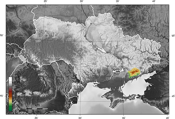Северный склон обрывистый, южный - пологий, постепенно снижаясь, переходит в узкую полосу приморской Приазовской низменности.