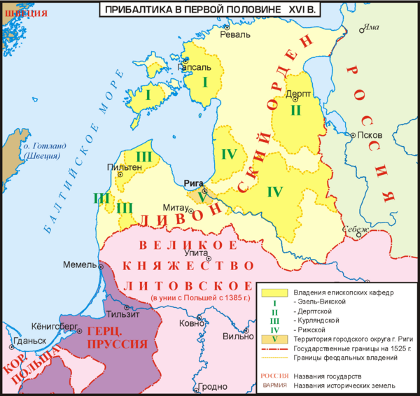 - Епископство Рижское обосновалось в Риге в 1201 году; с 1255 года — архиепископство[50];