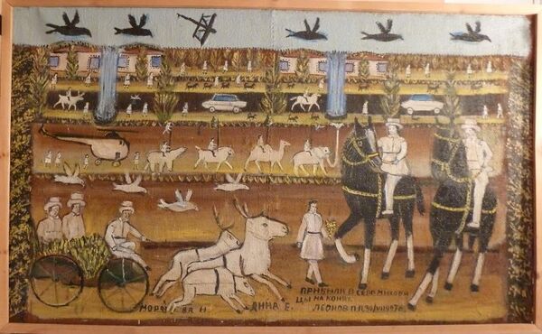 Композиция картины разворачивается на фоне условного пейзажа. Пространство полотна разделено на горизонтальные зоны, каждая из которых заполнена различными людьми, животными и машинами. На переднем плане справа выделяются два всадника в белых одеждах, сидящих на чёрных конях. С левого края навстречу им движется колесница, запряжённая оленями. В нижней части полотна размещена надпись: «Мороз В.А. и Анна Е. прибыли в село Меховицы на конях».