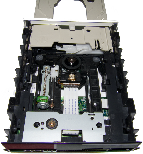 - система перемещения головки имеет собственный приводной двигатель, приводящий в движение каретку с оптической головкой при помощи зубчатой либо червячной передачи. Для исключения люфта используется соединение с начальным напряжением: при червячной передаче — подпружиненные шарики, при зубчатой — подпружиненные в разные стороны пары шестерней.