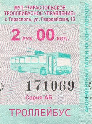 В городах Тирасполь и Бендеры действуют троллейбусные линии. Также с 1993 года действует одна из немногих в СНГ междугородних троллейбусных линий между Тирасполем и Бендерами.