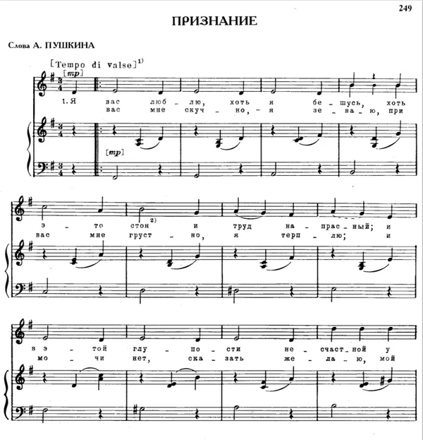 Романс «Признание» поражает законченностью, типично глинкинской афористичностью музыкального высказывания, позволяющего ему самые «громкие» слова произносить затаённо, почти с шутливой интонацией, что придаёт музыке одновременно и мягкий комический, и глубоко лирический оттенок. Романс воспринимается как признание в лёгкой, платонической влюблённости, не имеющей ничего общего с бурными страстями, обретениями и потерями. Глинка, конечно же, не мог не знать, кому посвятил Пушкин свои стихи, и безупречно /…/ передал в своей музыке их смысл и настроение[2].