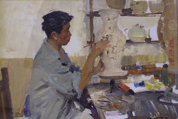 На картине изображён черноволосый мужчина, сидящий за столом в профиль вправо. Перед ним на подставке размещена керамическая ваза, а на поверхности стола лежат кисти, краски и флаконы. Светлый фон подчёркивает детали композиции и предметы, связанные с художественной деятельностью.